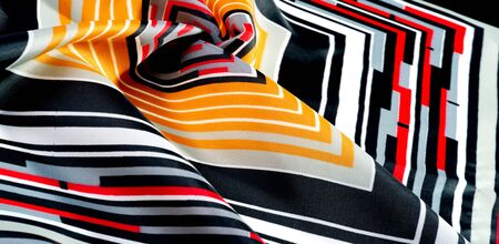 White silk fabric with red and black geometric rhombus shapes. abstract illustration pink-orange franc, close-up, background for design, vintage bright pattern. Texture. Background. Template.