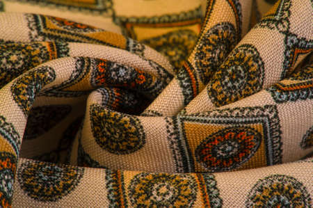silk fabric in soft beige color with a print of rhombuses, squares and medals. Tell a story and make a statement with traditional design work that has charm and value. Texture background pattern