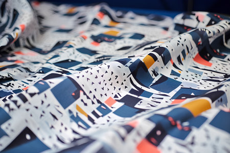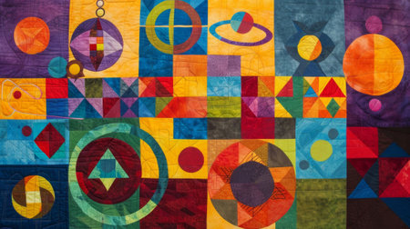Geometric textile design features bold, contrasting colors and patterns for modern fashion. the arrangement includes stripes, circles, and squares in vibrant shades, ideal for contemporary apparel and accessories.