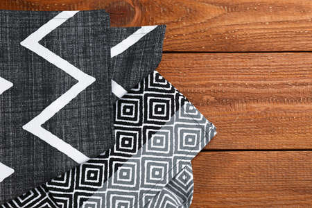 Beautiful kitchen towels on wooden table, flat lay. Space for text
