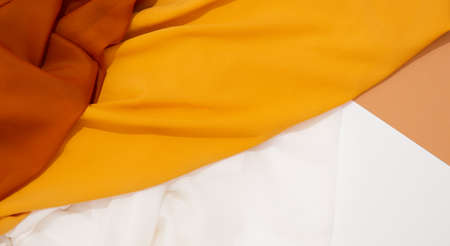 Autumn colors textile background Beige brown yellow fabric. Autumn, fall concept. Flat lay, top view, copy space. Fashion autumn aesthetic