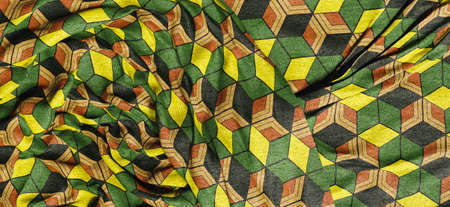 White silk fabric with green and black geometric rhombus shapes. abstract drawing chartreuse franc, close up, background for design, vintage bright pattern. Texture. Background. Template.