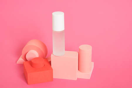 glass perfume bottle on geometric stands on pink background copy space