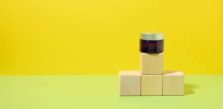 a blue glass jar with a gray lid stands on wooden cubes, yellow-green background. Cosmetic product display template