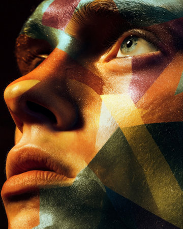 a man's face adorned with a mix of intricate geometric shapes creates a visually captivating image. layered imagery, featuring elements of irony, is complemented by the use of color reversal film and dramatic diagonals. this artistic work draws inspiration from the renowned movement of young british artists (ybas) and showcases bold graphic design influenced by bryce 3d. the composition skillfully employs strong contrasts and chiaroscuro