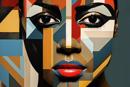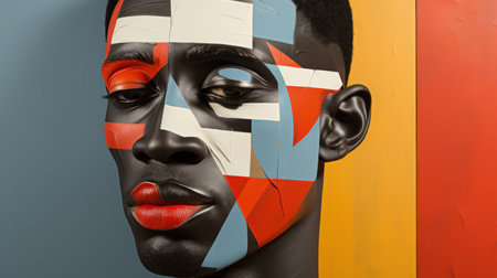 A striking artistic representation of an African man with his face painted in bold geometric shapes, inspired by cubism and modern art.