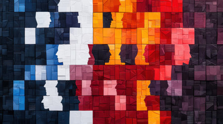 A stunning mosaic artwork featuring colorful human silhouettes in profile, showcasing themes of diversity and creativity through vivid color and texture.