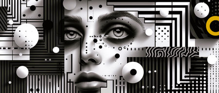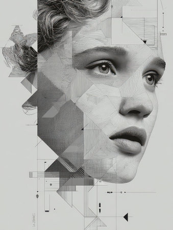 This striking abstract portrait combines geometric patterns and fine lines, creating a unique visual narrative. The monochromatic tones enhance the emotional depth.