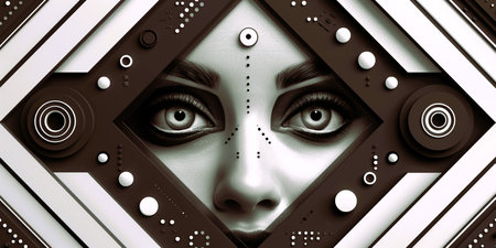 A womans face is shown through a grid of squares. AI generative image. Positioned by mathematically right composition.