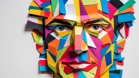 A man's face is made up of paper cutouts. The image is a collage of different shapes and sizes, creating a unique and abstract representation of the face. Scene is somewhat chaotic and disordered