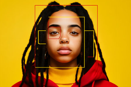 Portrait of a young person with facial recognition markers over their face, set against a vibrant yellow background, representing technology, identity, and biometric data analysis.