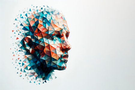 An abstract face made of multi-colored triangles. Space for text