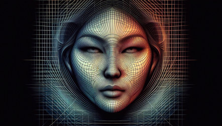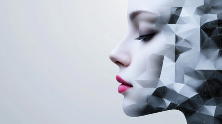 A womans face is made up of triangles and lines, AI