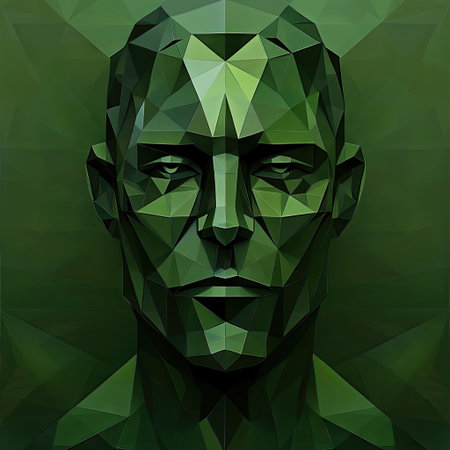 Close-up polygon portrait of a man's head and upper torso. The image is rendered in a deep forest green color and features a highly stylized, geometric design. The subject's expression is serious and intense. The polygonal shapes create a textured effect.