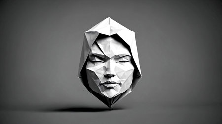 Captivating origami face sculpture, a blend of modern art and ancient craft. Its geometric precision and monochrome palette create an air of mystery and sophisticated elegance, perfect for conceptual projects.