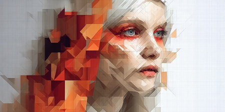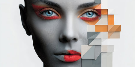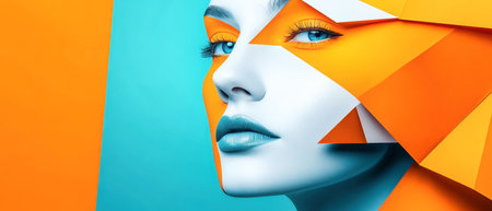 This artistic representation showcases a stunning woman's face using geometric shapes in orange, blue, and white. The striking colors merge fashion and abstract art seamlessly.