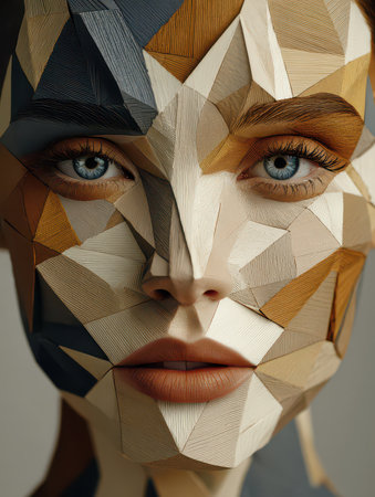 Abstract Geometric Portrait of a Polygonal Woman with Vibrant Colors and Bold Makeup Artistry