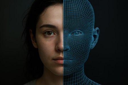 AI Image Human Face and Digital Mesh Fusion Concept
