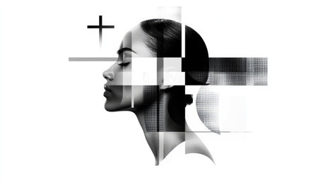 A high-contrast black-and-white digital artwork featuring a woman's face fragmented by abstract glitch effects, conveying a modern, edgy mood.