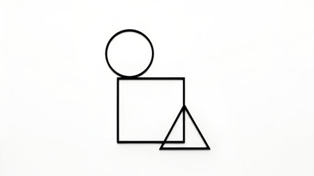 Simple black geometric forms (circle, square, triangle) arranged in balanced composition, sharp lines, white background.