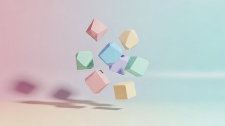 Soft pastel colored geometric cubes floating in a gentle arrangement against a gradient background.