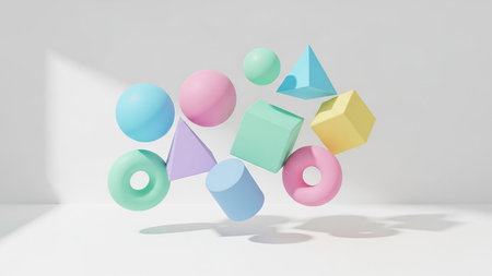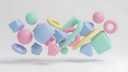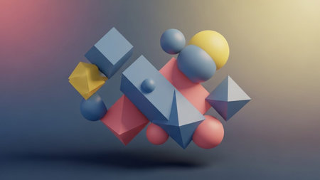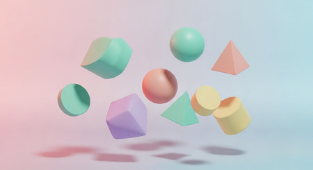 Pastel colored geometric shapes floating in a minimalist abstract composition