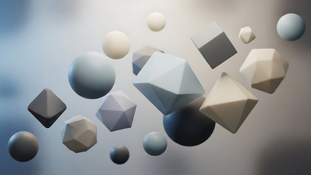 Asymmetrical arrangement of muted tone geometric shapes like cubes, spheres, and rings floating in a clean...