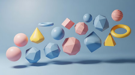 A creative and dynamic of 3D colorful geometric shapes, including spheres, cubes, triangles, and pyramids, floating in mid-air against a gradient background. Clear details and vibrant colors enhance visual appeal.