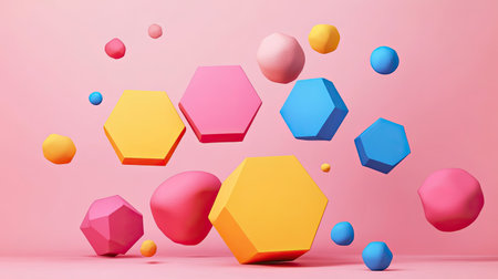 This image showcases a dynamic arrangement of colorful geometric shapes in vibrant hues, floating gracefully against a soft pink backdrop, perfect for modern design projects.
