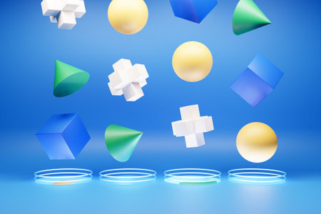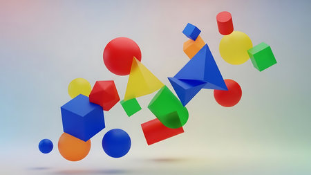A D render of geometric shapes in vibrant colors floating over a white background