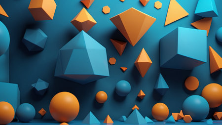 Vibrant geometric shapes on blue background: spheres, cubes, and pyramids in dynamic arrangement.