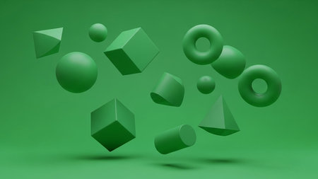 3d rendering of abstract geometric shapes levitating in air on green background