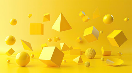 3D rendering of a vibrant yellow background with floating geometric shapes, including cubes, spheres, and pyramids, creating a dynamic and modern design.