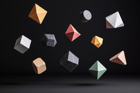 Colorful polyhedra suspended in mid-air form an intriguing display. Each unique shape and hue contributes to a captivating visual experience that draws attention and sparks imagination.