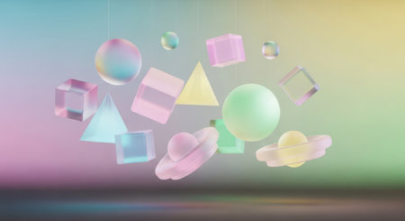 A collection of translucent geometric shapes including cubes, spheres, and prisms in pastel colors, floating in a...