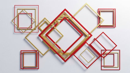 3d rendering of abstract geometric composition made of red and golden frames on white background
