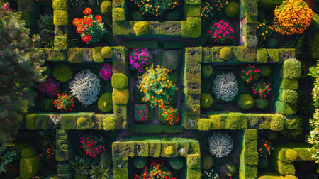 A bird eye view of a garden labyrinth, with neatly trimmed hedges and vibrant flowers creating a stunning pattern.