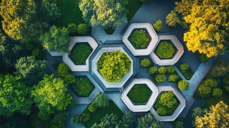 Aerial view of hexagonal garden patterns in a city park, blending nature with geometric design