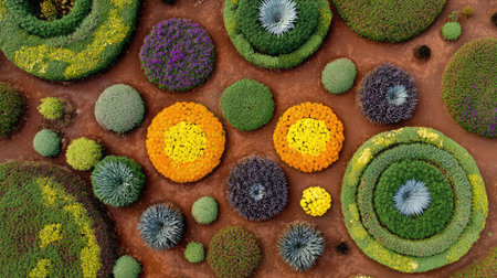 Captivating aerial view of a garden featuring circular flower beds in vibrant colors, showcasing the beauty of nature and innovative landscaping in a serene environment.