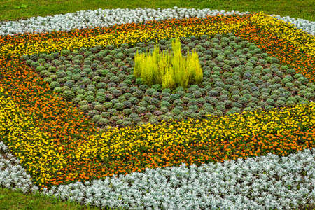 Aerial view of beautiful ornamental garden with green grass and flowers