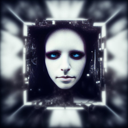 a woman with a demonic makeover on her face, captured in a close-up intensity. this haunting image, reminiscent of jasper francis cropsey's style, showcases dark white and light red tones. the photo, taken with a nikon d750, exudes an eerie atmosphere, resembling smartphone footage. ai generated