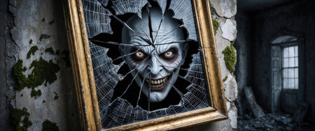 Scary vampire is looking through the broken glass of a picture frame hanging on the wall of an abandoned house