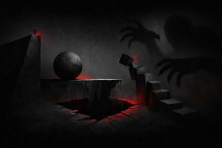 A figure stands on a platform next to a sphere while shadows loom over a stairway and a hole, creating a tense atmosphere.