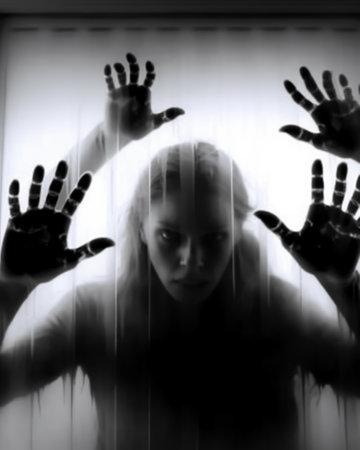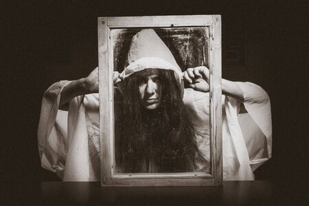 Horror ghost woman behind the matte glass. Halloween festival concept.