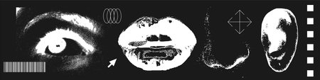 Retro photocopy effect face parts collection. Female eye, mouth, nose and ear with grunge punk messy texture. Trendy y2k aesthetic vector illustration. Ideal for anti-design , t shirt, tee print