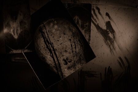 Bloody x-rays hanging on a rope in a dark room. Terrible room doctor maniac or killer.