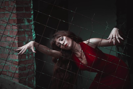 Ghost Woman Horror scene Death movie with Halloween Makeup holding side wall in Darkroom.