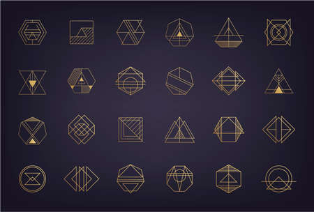 Vector set of abstract geometric logos. Art deco, hipster, golden line style. Circle, triangle, polygon linear shapes. Aztec, magic, esoteric icons, sacred geometry
