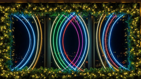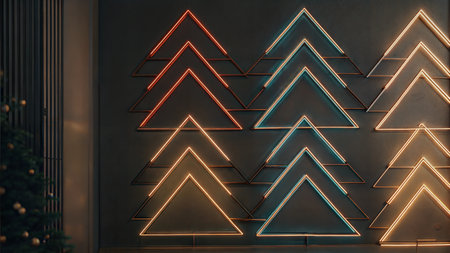 Geometric neon light Christmas trees on a dark wall. Warm and cool tones create a modern festive mood. Ai generated