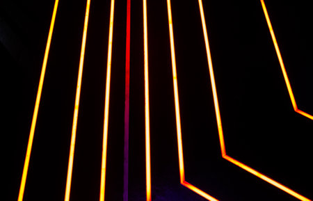 Angled corner of a red neon sign bulb with an orange centerline on black background